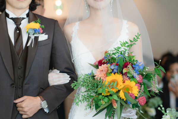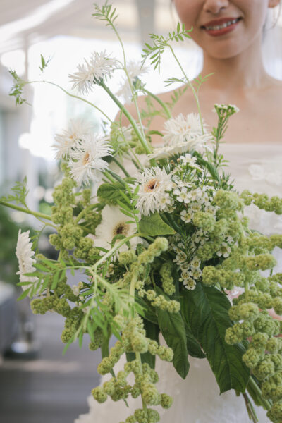色や花材、フォルムひとつで、花嫁がまとう空気感までも変わるため、こだわりたいアイテムのひとつ。
