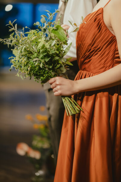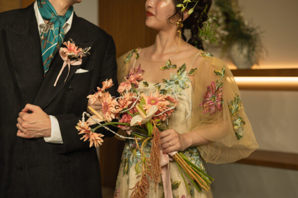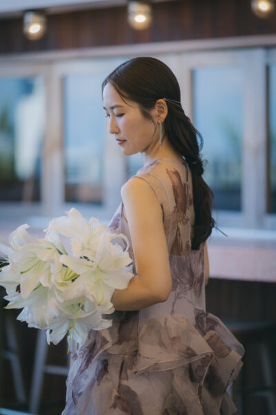 ドレスと花材のカラーをリンクさせることで、より統一感のあるコーディネートが叶います。