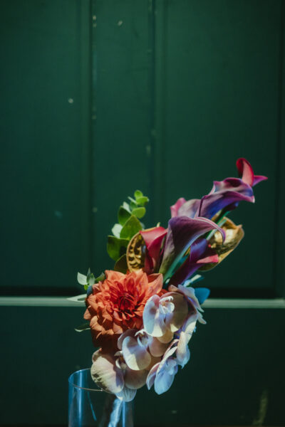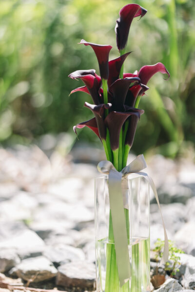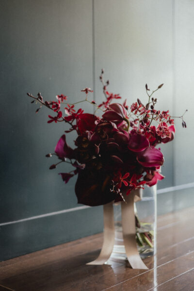 格好よくクールなイメージのボルドーも、合わせる花材によってまったく違う表情に。