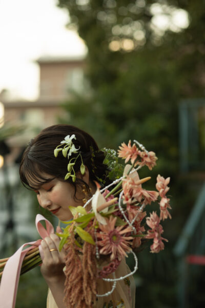 小花はあえて、淡ピンク・淡パープルのパステルカラーを使い抜け感を演出。