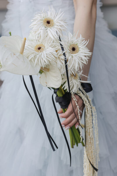 リボンもホワイトで統一し、より凛とした雰囲気に仕上げています。