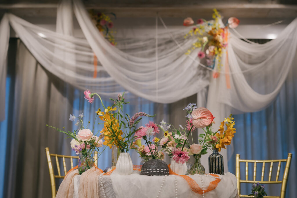お花の色合いやボリューム、小物の組み合わせによって会場の雰囲気はぐっと変わります。